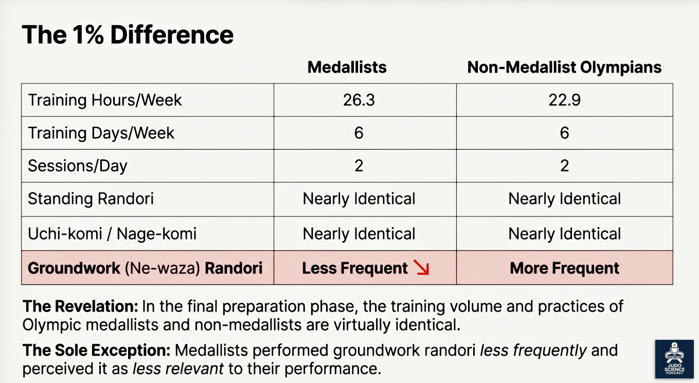 One of the more intriguing findings: Olympic medalists spent less time doing groundwork randori — and they reported it felt easier too.