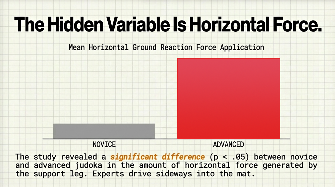 Now imagine you’re on grippy tatami — when you push sideways into the floor, it pushes back. That firm resistance lets you sweep hard and stay balanced. That’s horizontal GRF in action. Advanced judoka generate more horizontal ground reaction force because they: