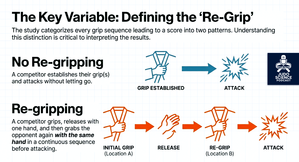 Explanation: The article cites the study showing re-gripping led to significantly higher scores when judoka targeted unconventional grips beyond the classic collar-and-sleeve