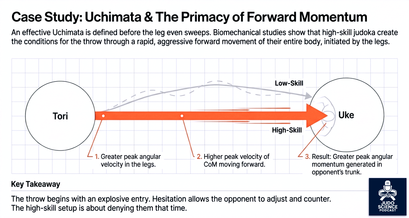 Successful Uchimata is defined by explosive forward drive of the centre of mass, not graceful leg elevation. High-level athletes close distance rapidly, generating angular momentum in uke’s trunk before the leg ever dominates the picture.Research shows: