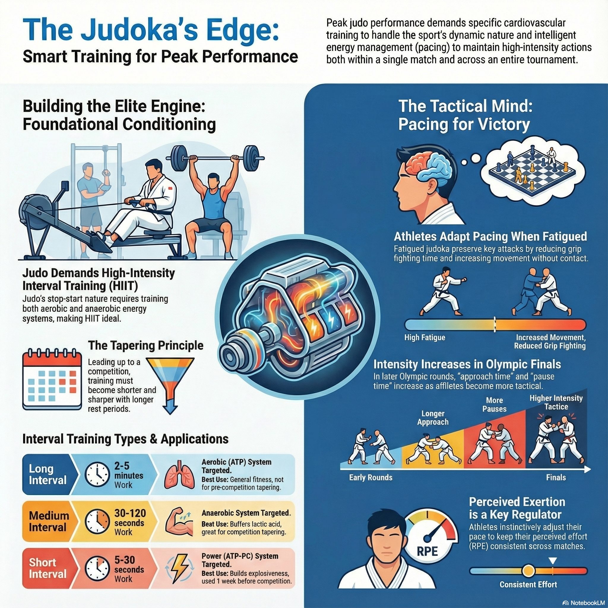 In this NotebookLM podcast episode, we look at Judo training methodologies and combat dynamics, with a particular focus on cardiovascular fitness and pacing strategies. One article offers practical guidance on cardio for Judo players, advocating for High-Intensity Interval Training (HIIT) due to the sport's stop-start nature and the need for rapid recovery between intense bouts. The other two sources present scientific studies investigating physiological responses and pacing in simulated and actual Judo matches, analysing effort-pause ratios and decision-making under various fatigue levels and championship phases..